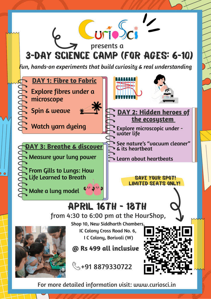 Give your child an exciting opportunity to explore science beyond textbooks in this immersive 3-day Science camp. From understanding why we wear cotton in summer and wool in winter we get to how each of these fibres are different, to observing fascinating microscopic organisms like paramecium and daphnia, every session is designed to ignite curiosity. Children will not only experiment and observe but also actively create—spinning yarn, weaving fabric, measuring their own heartbeat, and building a working lung model. Through guided activities that connect science to everyday life, this workshop nurtures critical thinking, observation skills, and a genuine love for learning—all in a fun, safe, and engaging environment. Limited seats ensure personal attention for every child.